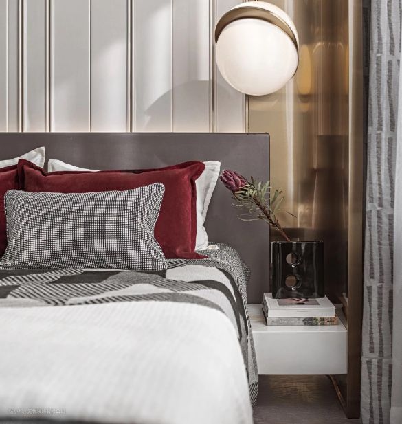 球形床头吊灯设计大胆,暗红色天鹅绒靠枕头和棉麻材质的床,温暖柔软。