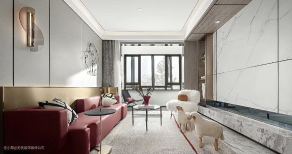 电视背景墙铺设大理石纹理面料的墙板,简单清爽,有轻奢的味道。