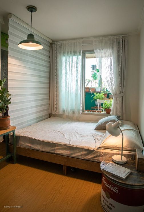 主卧靠着阳台,大大的落地窗可以看到外面的绿植盆栽。屋主对卧室没有太高的要求,所以摆设就比较简单。