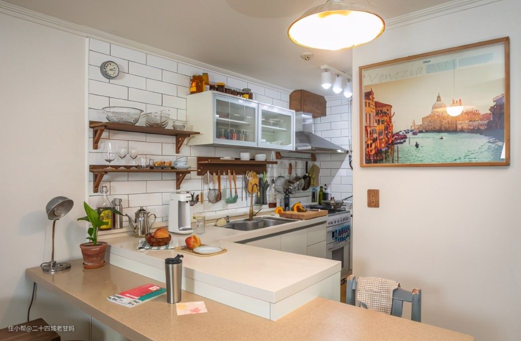没有单独的餐厅区,所以为了合理利用空间,屋主就打造了开放式的厨房,餐厅实际上就是一个小吧台,和橱柜的台面完美拼接,很好地利用了空间,还能够增进家人之间的互动。
