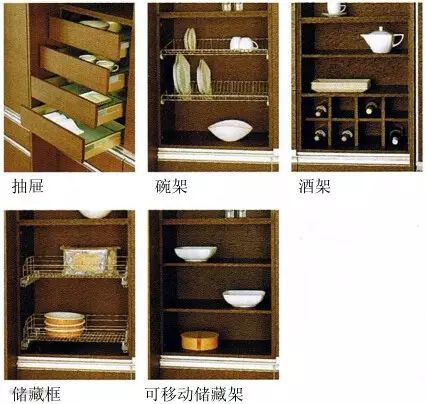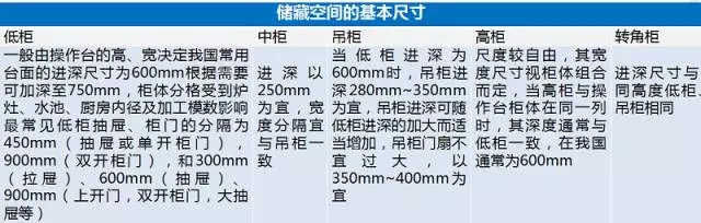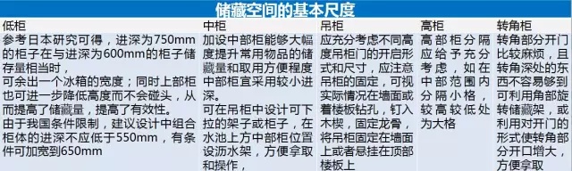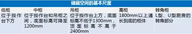 厨房储藏空间的各组成部分的尺寸应根据人体尺度、活动范围及相关的设备的尺寸要求来确定。