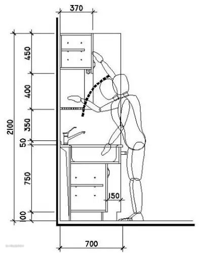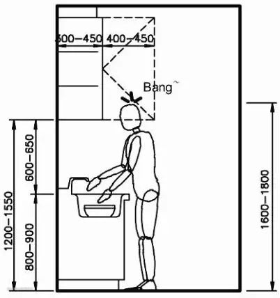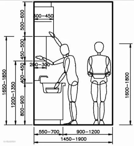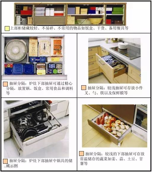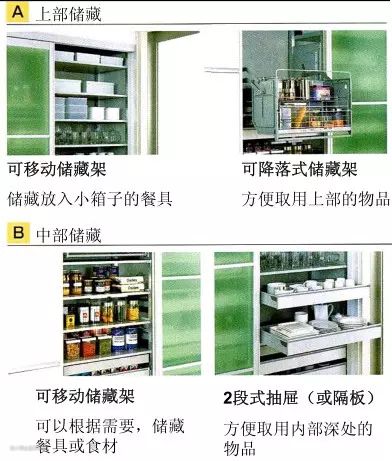 在厨房中,根据人体动作行为和使用舒适性及方便性要求,把柜体高度划分为上部、中部、下部三个区域: