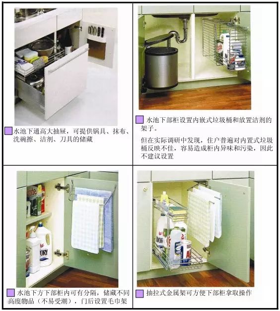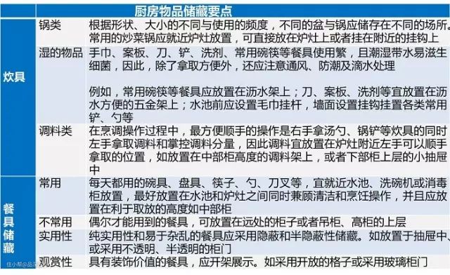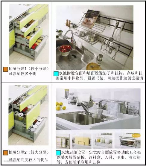 ▶ 最常用的物品置于操作程序中可随手取的范围之内(如餐具其滤水架、砧板、抹布等就近水池储藏,方便清洁、操作)