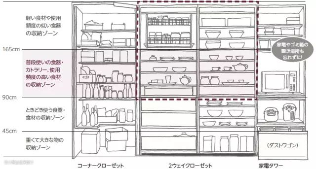 ▶ 不常用物品比如备用餐器具,放在上部柜,提供长期、固定的储藏。