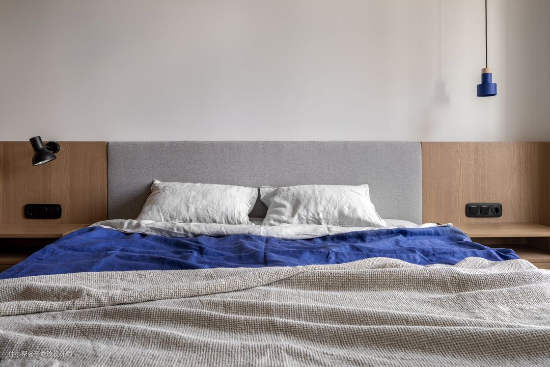 所以,床头两侧的开关高度大概在80cm的高度就可以了,也可以比床垫高30cm左右,这样方便睡的时候一伸手就能关灯。