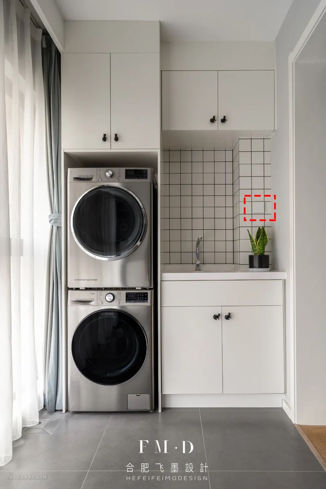 洗衣机、烘干机插座各一个,洗衣池上方备用插座1个。
