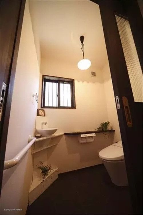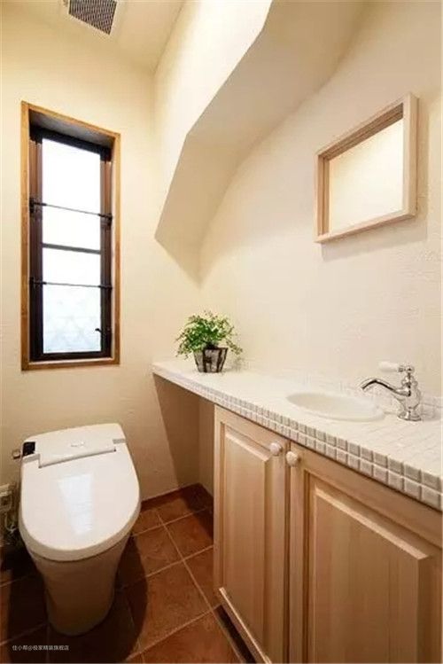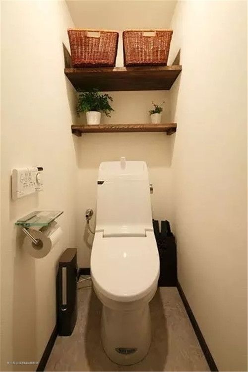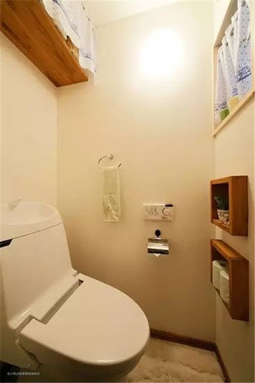 这张小卫生间的装修非常注重实用性,即使是在这样狭小的面积中也设计了收纳区,马桶上方使用木板打造的隔层储物处,能够存放一些物品,也能放置一些植物,让小小的卫生间也具备超强的收纳功能。