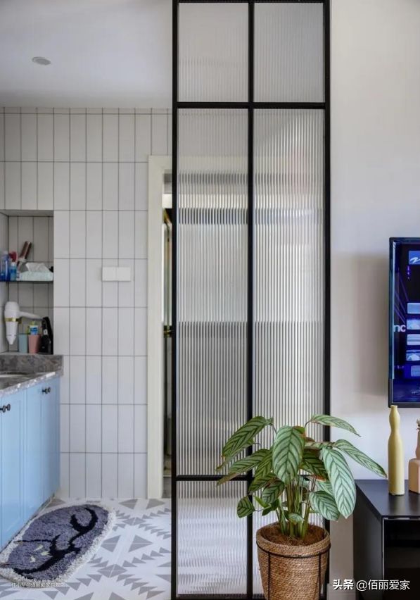 长虹玻璃隔断客厅正对卫生间的地方,遮住隐私尴尬,放置一盆绿植还起到点缀客厅电视背景墙的作用。