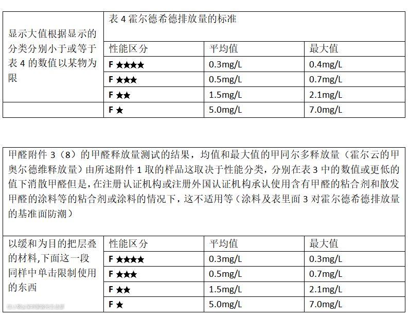 【图中所示:F4星的甲醛释放量≤0.4mg/L,采用干燥器法检验,测的是甲醛溶于水后的浓度,因此单位(mg/L)和其他国家的不同。】