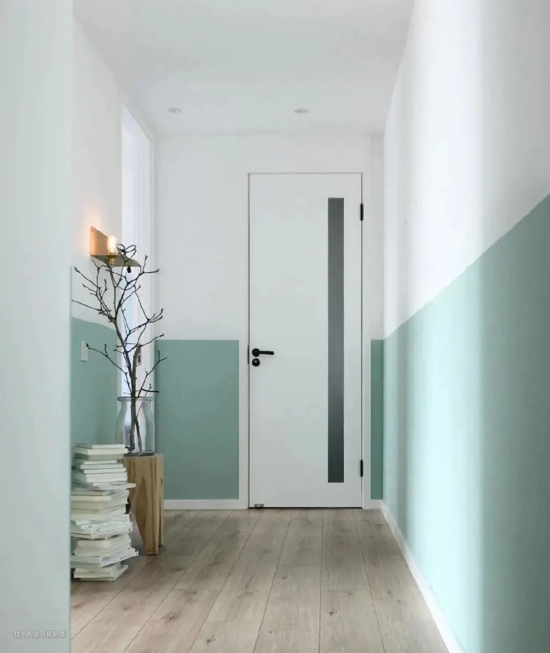 当然粉色还可以搭配粉蓝色做几何装饰的墙面效果,可以调整视角,显得墙面更高更开阔。