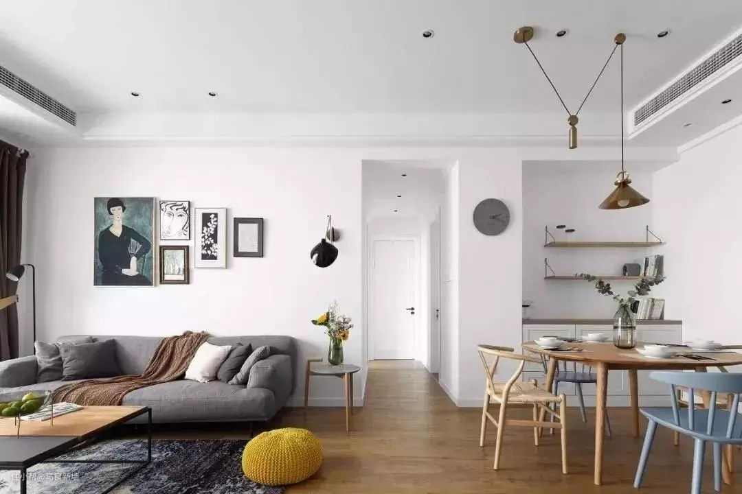 但纯白色的墙面是没有太多亮点,可以搭配高级灰色系的沙发、地毯、想要简约风可以搭配细框桌椅,搭配外部重色(例如黑色)冷光吊灯做部分重色点缀,还可搭配几幅简约的装饰画进行装饰,都可让家变得简约又明亮。