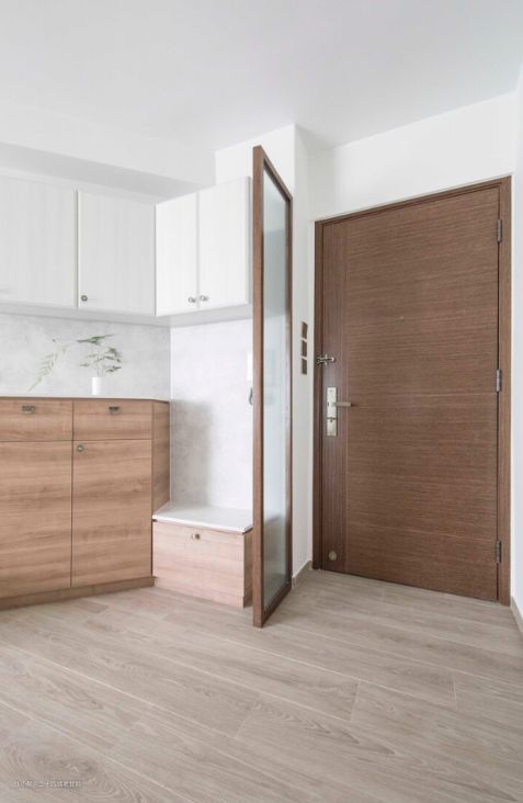 玄关区域的墙体是有点斜面的,角落处改成了换鞋凳,正好把不太好利用的空间利用起来。木质的鞋柜看上去也比较温馨,也能满足家里的收纳。