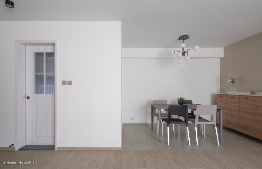 餐厅有单独的区域,墙面没有过多装饰,四人餐桌也够一家人团聚的时候使用。餐厅的地面铺了灰色的水泥瓷砖,更加方便打扫卫生。
