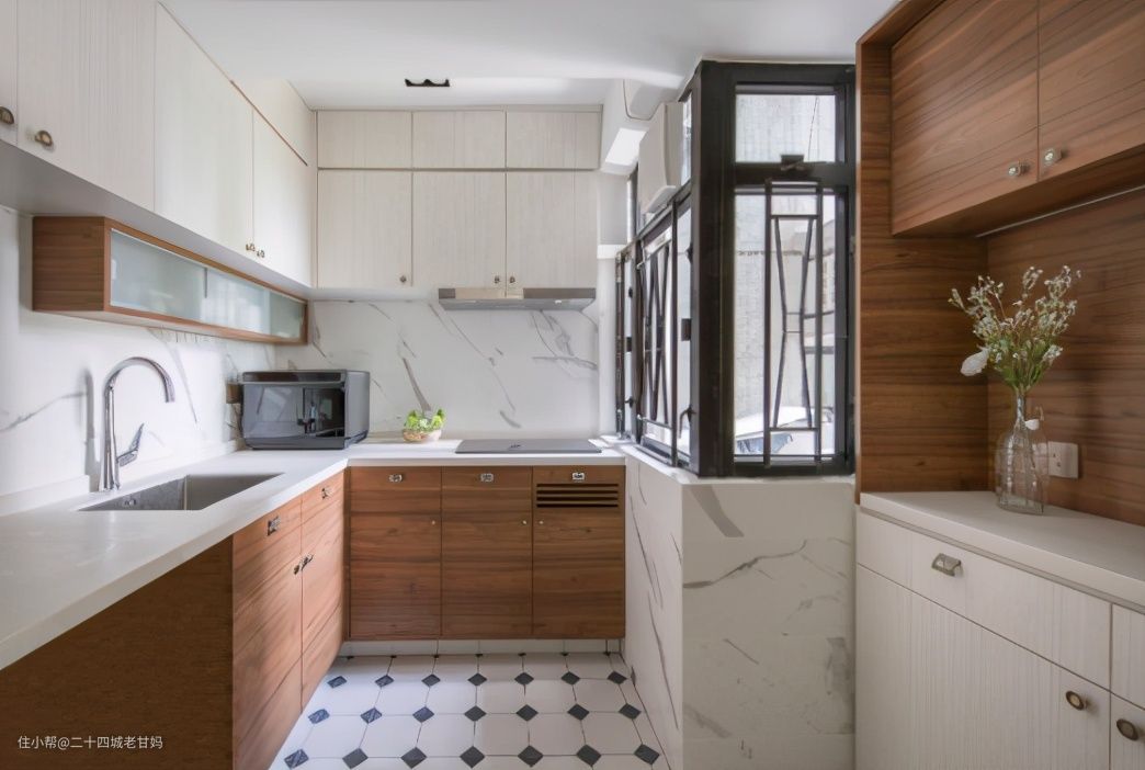 厨房做了L型的橱柜,白色和木色的搭配,窗户也更加有助于采光和通风,虽然不大,但是自己一个人使用也足够了。