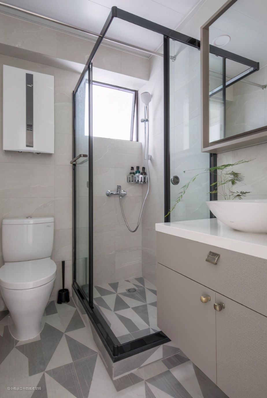 卫生间的面积不算大,在角落安装了淋浴房,马桶和洗漱区也是简洁大气。