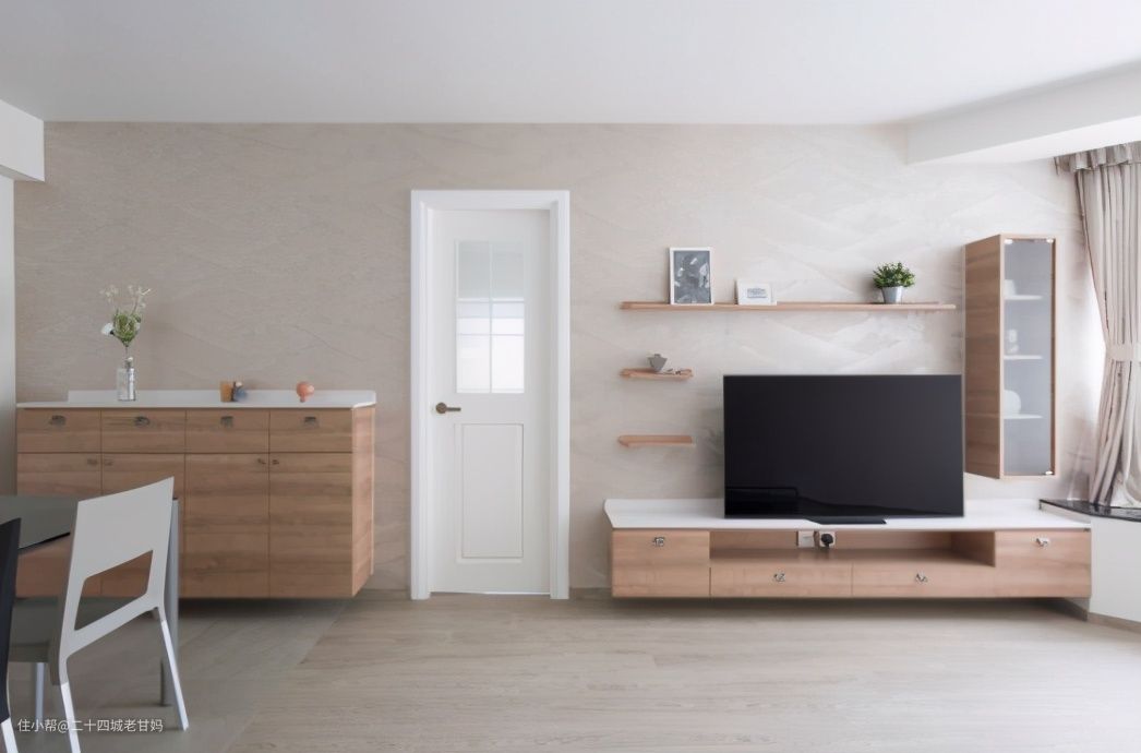 客厅墙面铺了米色的暗纹墙纸,地板铺了大地色木地板,更加柔和。电视柜和餐边柜都是定制,悬挂在墙壁上,底部留空,看上去也不会过于笨重,也能够方便扫地机器人打扫。