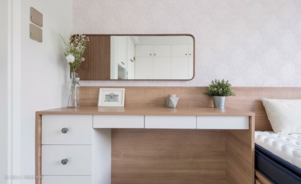 床头柜和床头背景是一体的,1.2米长的梳妆柜,看上去更加简单。