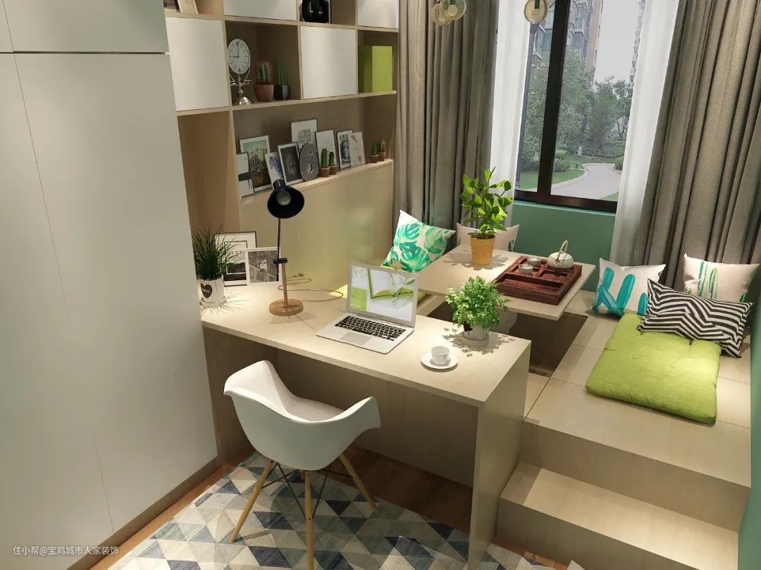 榻榻米床本身带有隐形式收纳空间,与整体式的书桌柜相连,整个空间显得更加的整洁。柜体配色采用原木色与白色,装饰上再用绿色进行点缀,整体感觉更加的舒适。