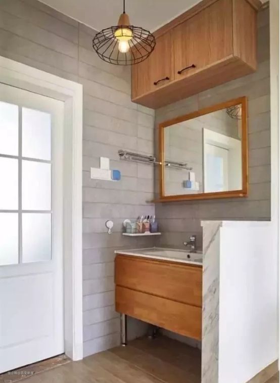 另外一种改造方式就是把洗手台外移,把洗手台橱柜放在外面,一个是起到干湿分离的作用,另外一个是节省了空间。这样早上里面的人上马桶,外面的人洗脸刷牙,可以做到互不打扰。