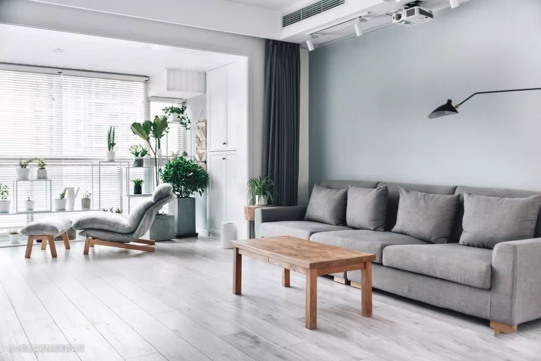 如果不想大动墙体,客厅和阳台可以选择同样的地板通铺,视觉上可以让客厅显得更宽敞。