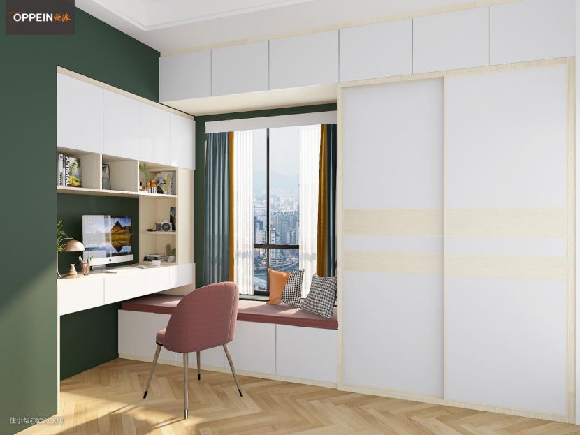 结合窗户的位置,在顶部和底部打造储物柜,一侧与衣柜完美衔接,另一侧打造办公、学习区,多重功能完美实现。