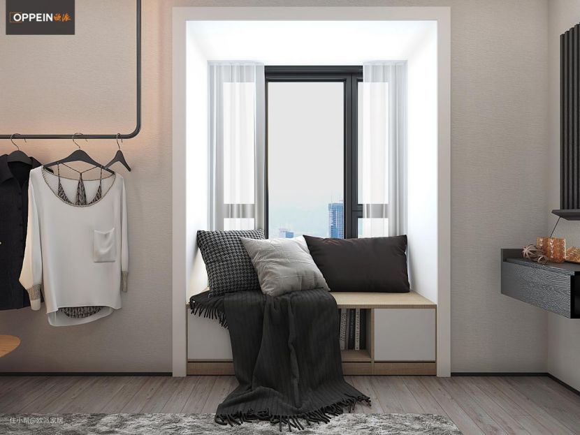 把飘窗左右或者上下设计成几个收纳空间,一侧做成半开放式一个储物柜,另一侧做成工作台+书架,再给自己留一个边休息边看书的小天地,一个精神角落就这样搭建好啦。
