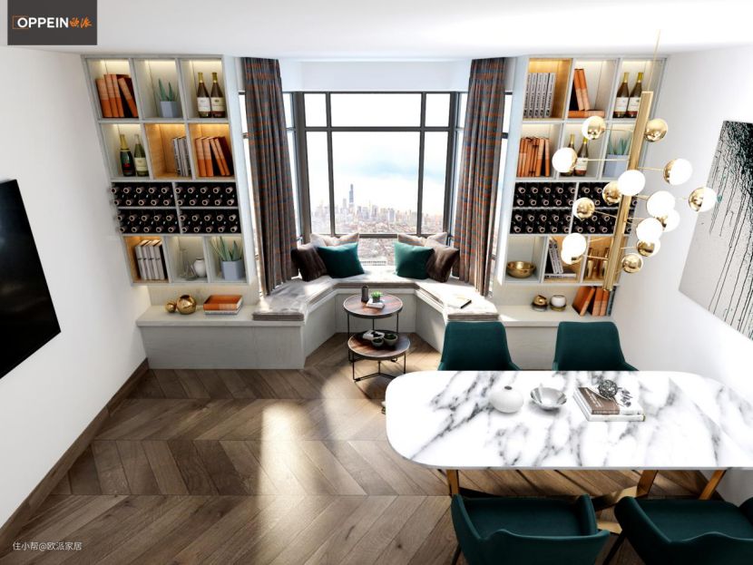 户型不按常规走,有点欧式风格的大气飘窗案例我们也有哦。飘窗位置定制带地柜的沙发凳子,完美贴合户型定制,两边定制嵌入酒柜的餐边柜。
