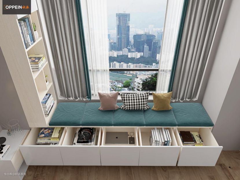 侧边展示架+抽屉的组合设计不但实现了收纳功能的多样化,也让飘窗这个区域变得更加实用,成为一个独立的生活区。