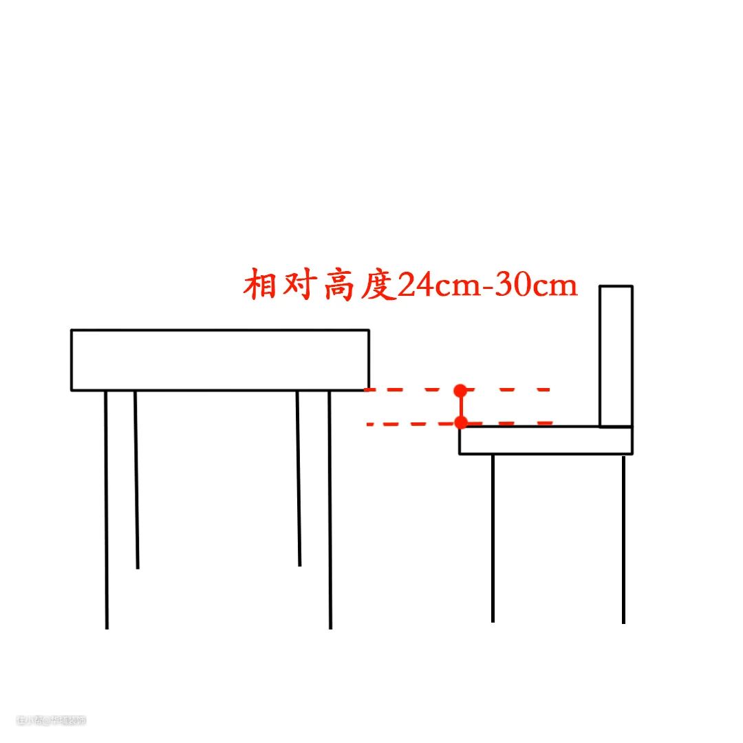餐椅的高度与餐桌的底部间距离在24cm-30cm即可。