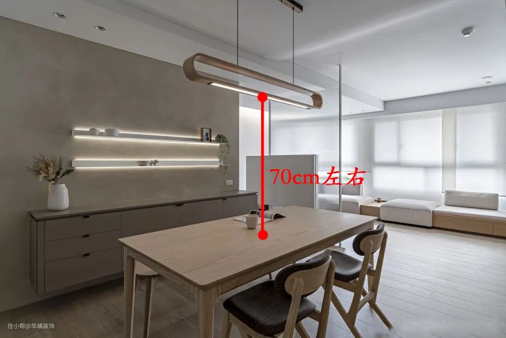 如果餐桌上方用吊灯,一般吊灯与餐桌的距离建议在70cm左右,如果层高不一样,需自行调整。