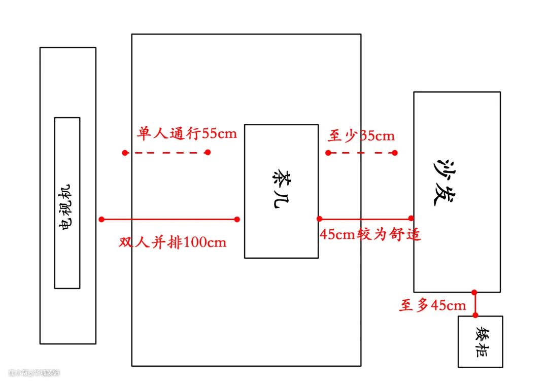 茶几与沙发距离→至少留35cm左右,人可以放下双脚,如果是45cm左右的话,就可以舒适的伸腿啦~