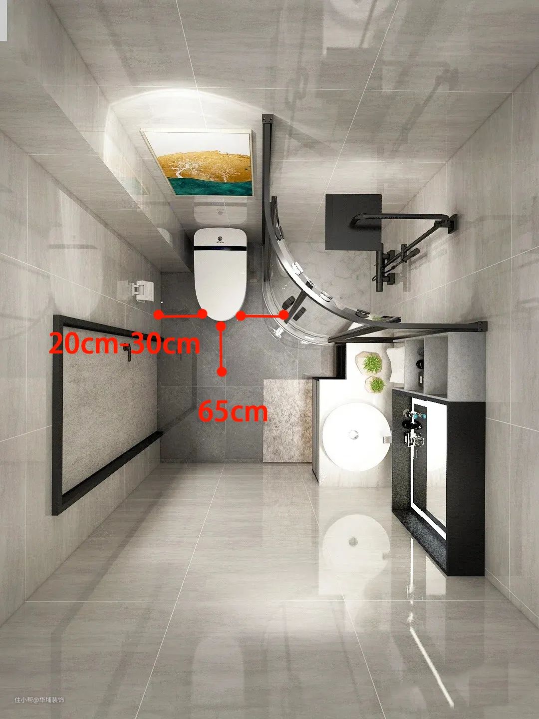 马桶两侧留20~30cm,坐着取物距离适宜。