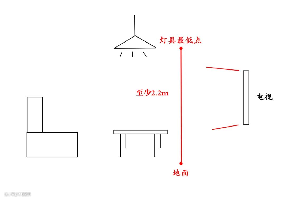 一般吊灯的最低点到地面的距离不低于2.2m,这个距离大于电视张开的5º角,不会产生眩光,看电视效果比较好哦~