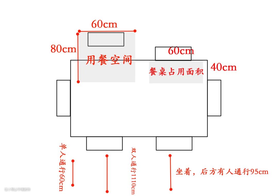 一个人的用餐空间宽度60cm,深度80cm,占据的餐桌桌面大小约为40cm×60cm。