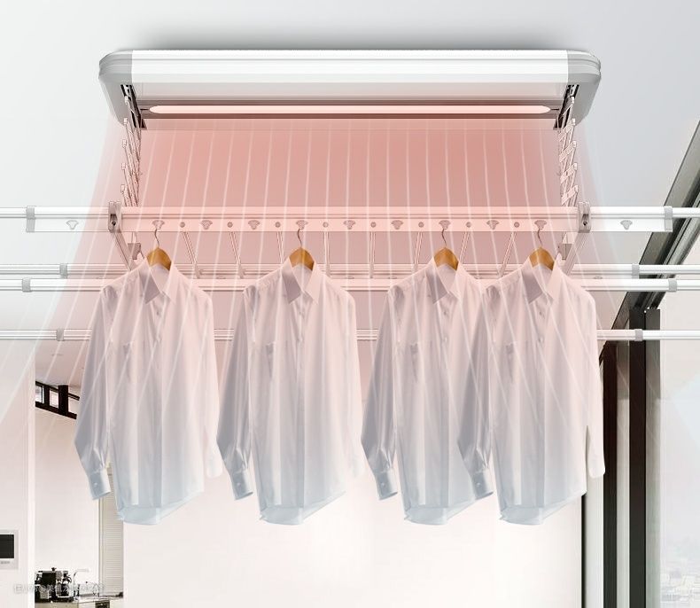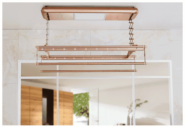手动的升降晾衣架仅有一个功能——晾晒衣服,现在市场上的电动晾衣架更加智能现代化,增加了照明、烘干、紫外线杀菌、语音控制等多种功能,可以满足不同家庭的需求,实用又人性化。