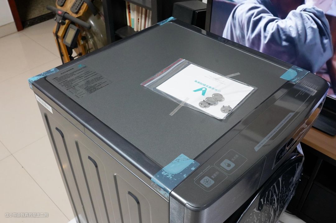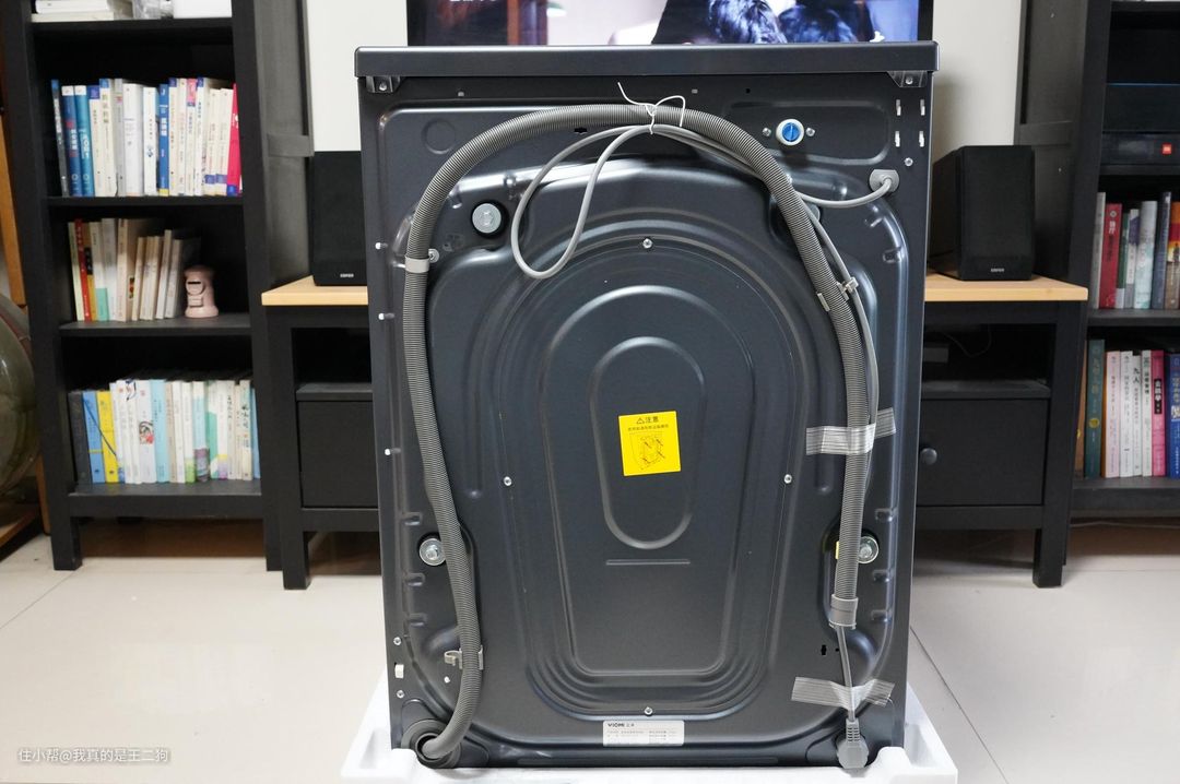拆掉背部的保护泡沫和保护袋后,一睹洗衣机的正面效果。之前的白色洗衣机使用时间稍长发黄是个问题,选择洗衣机的时候也会考虑配色,云米Neo2 Pro的银黑配色更有质感,整体设计感也做得不错。新机器内部也做了大量的固定和保护,防止洗衣机在运输过程中的滑动和磨损。