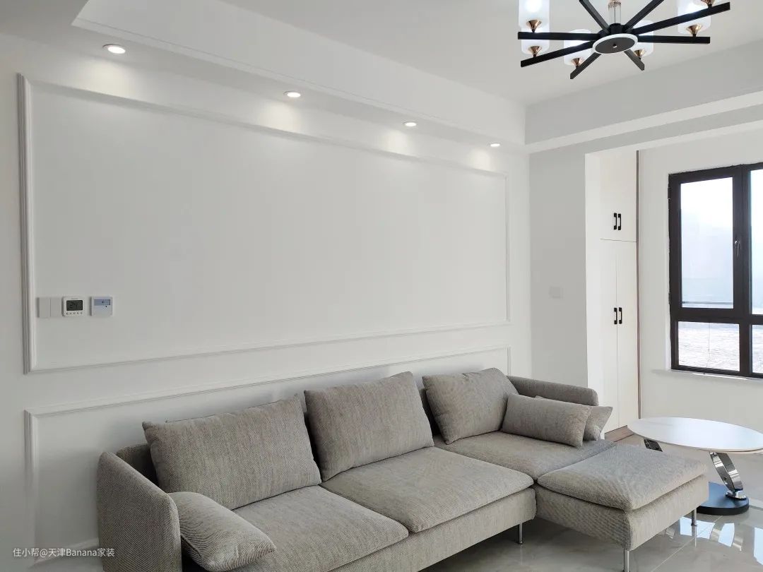 客厅的整体风格是以“黑白灰”为主调的极简主义风格,沙发背景墙融入了美式石膏线元素,增加墙面装饰性,提升视觉感受。