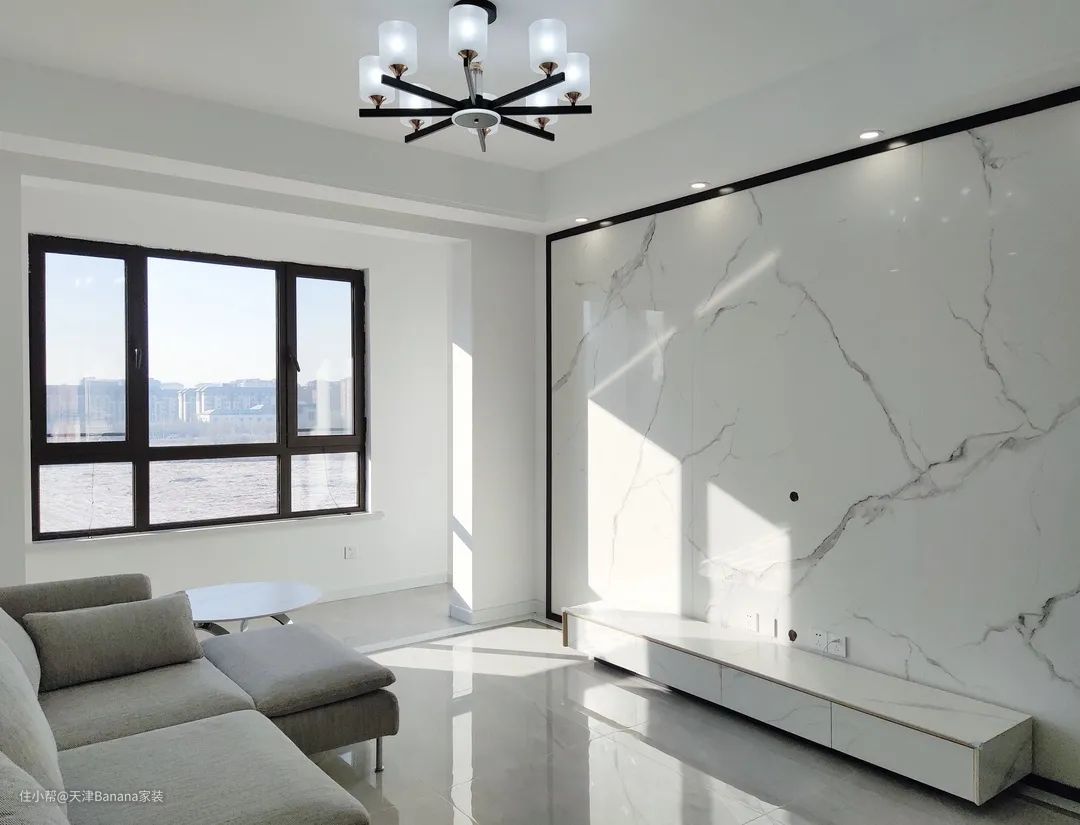电视背景墙采用地砖上墙的工艺,打造大理石花纹质感的背景墙,营造出客厅的通透感和品质感。