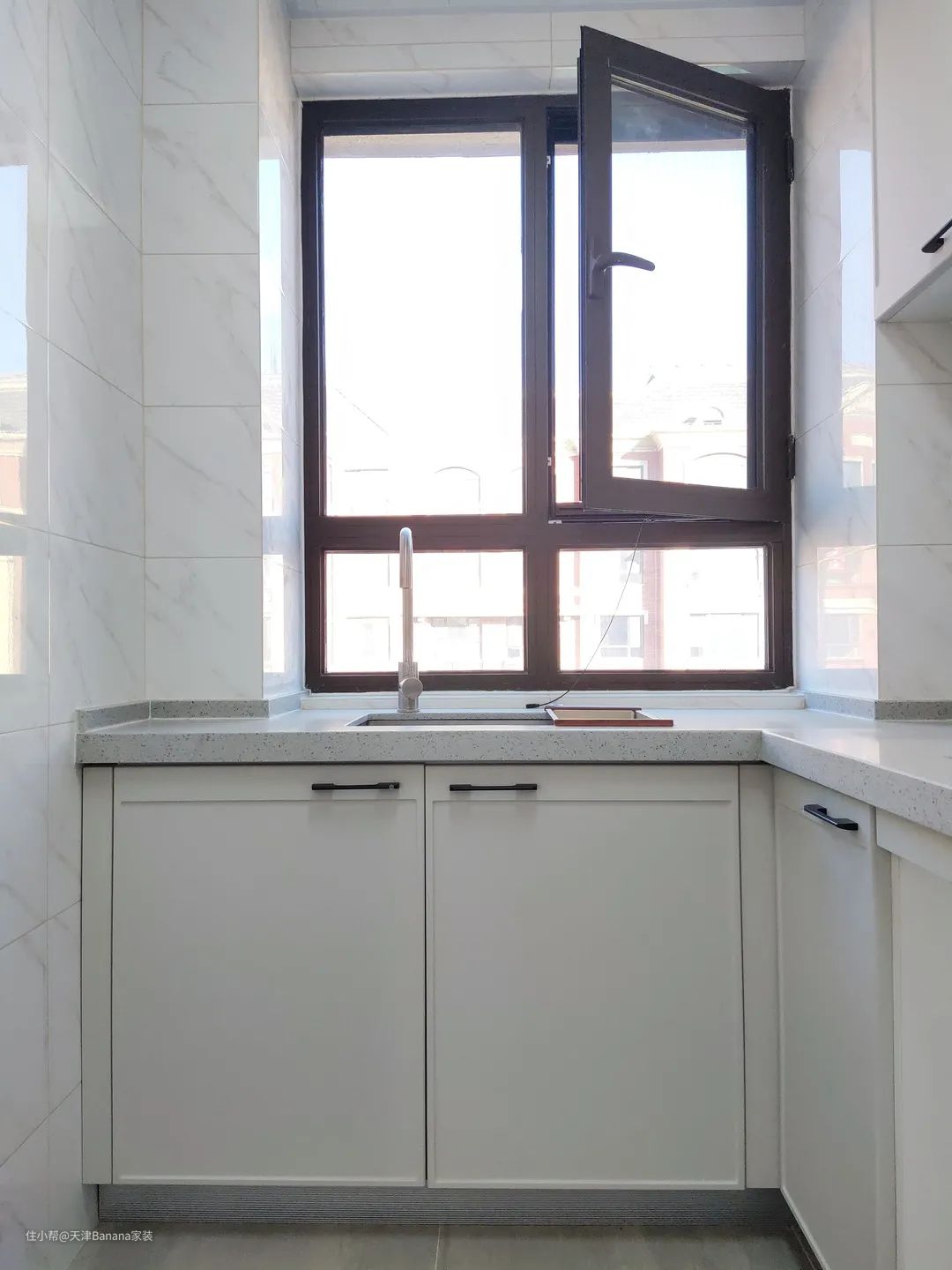 根据厨房户型,设置了L型橱柜,左侧为洗菜区。水盆升级为台下盆,更加便于整理和清洁台面,不易藏污纳垢。