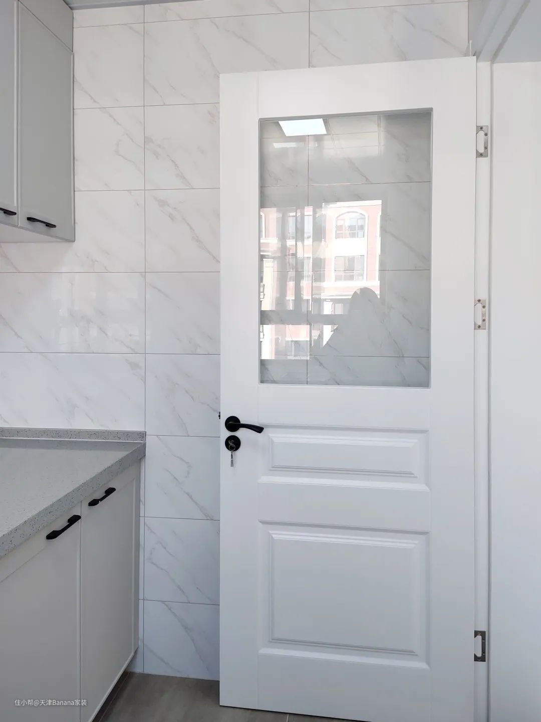 厨房门选用白色实木复合烤漆门,搭配透明玻璃。白色木门百搭美观,透明玻璃打造通透感。