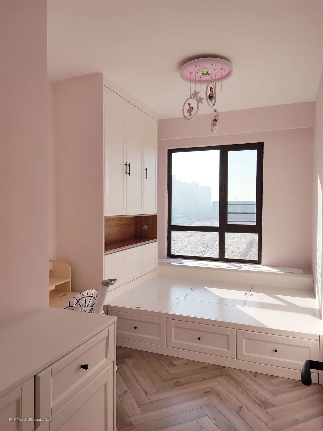 儿童房全屋涂刷了很有少女心的粉色,搭配白色榻榻米设计,满足储物需求,美观性也很好。