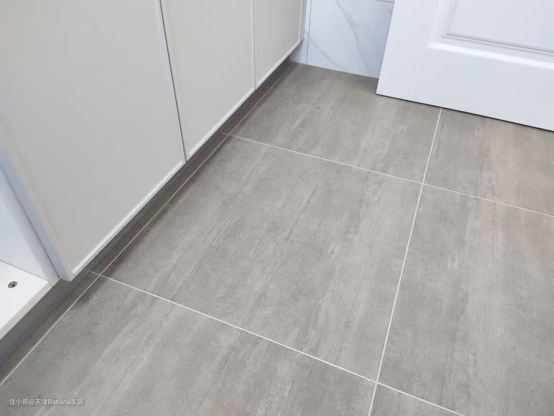 客餐厅整体地面瓷砖使用了圈线设计,白色深灰浅灰递进,结合金色美缝,搭配出丰富又融合的视觉效果。