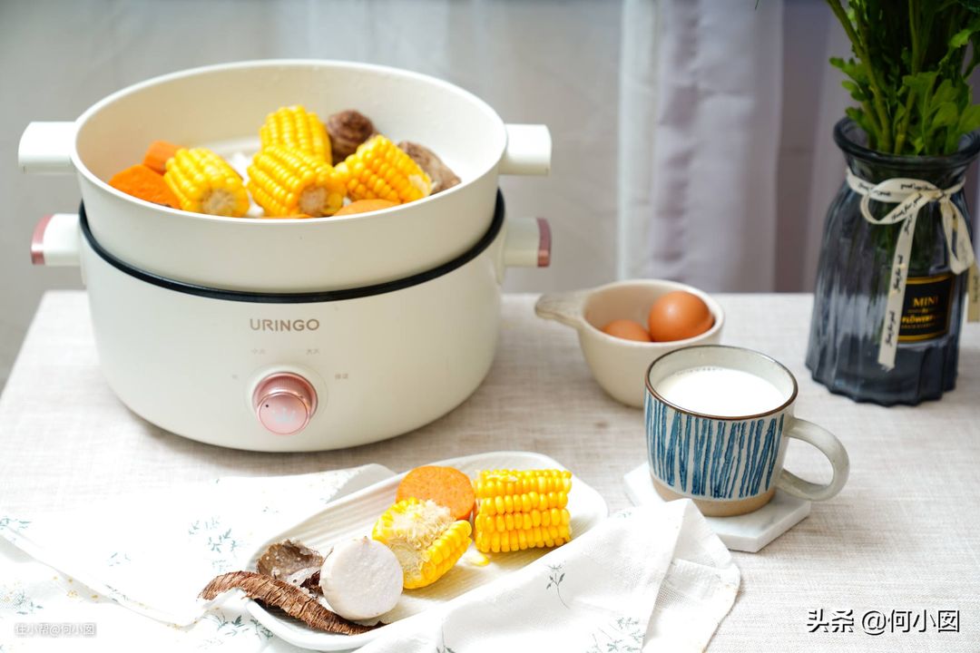 酱紫,开吃吧,暖暖的冬日晚餐,哈哈哈,吃杂粮饱腹感强,纤维多,晚上吃健康些,我这里是两根玉米棒子,2个小红薯还有5个毛芋头,够2个人晚餐的分量了,还有空隙,能再装一些