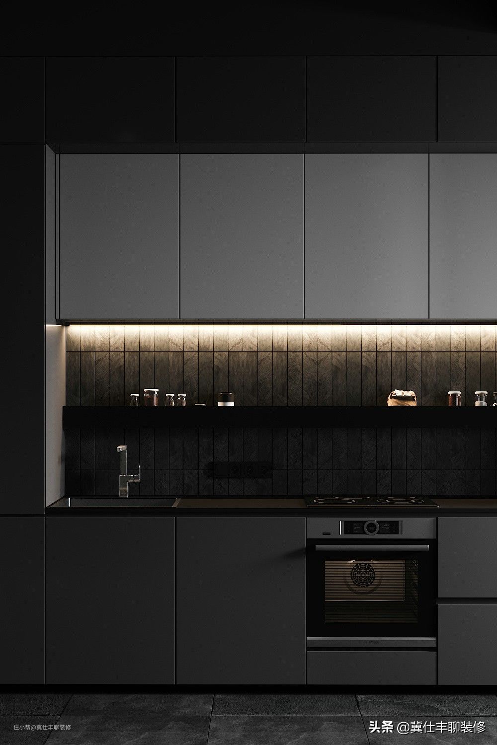 ▲ 餐厨区继续将黑灰调进行延伸,即使是黑色的墙面搭配灰色的橱柜,搭配上一条嵌入式灯带以后,形成了清晰的层次感,硬朗冷峻,时尚静谧。临窗设置了一组吧台,搭配两张吧台等,既可以作为餐桌,也可以作为休闲吧。