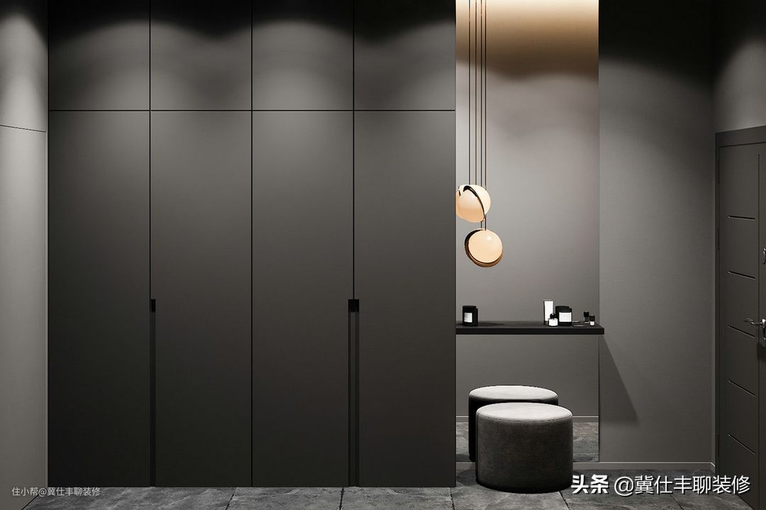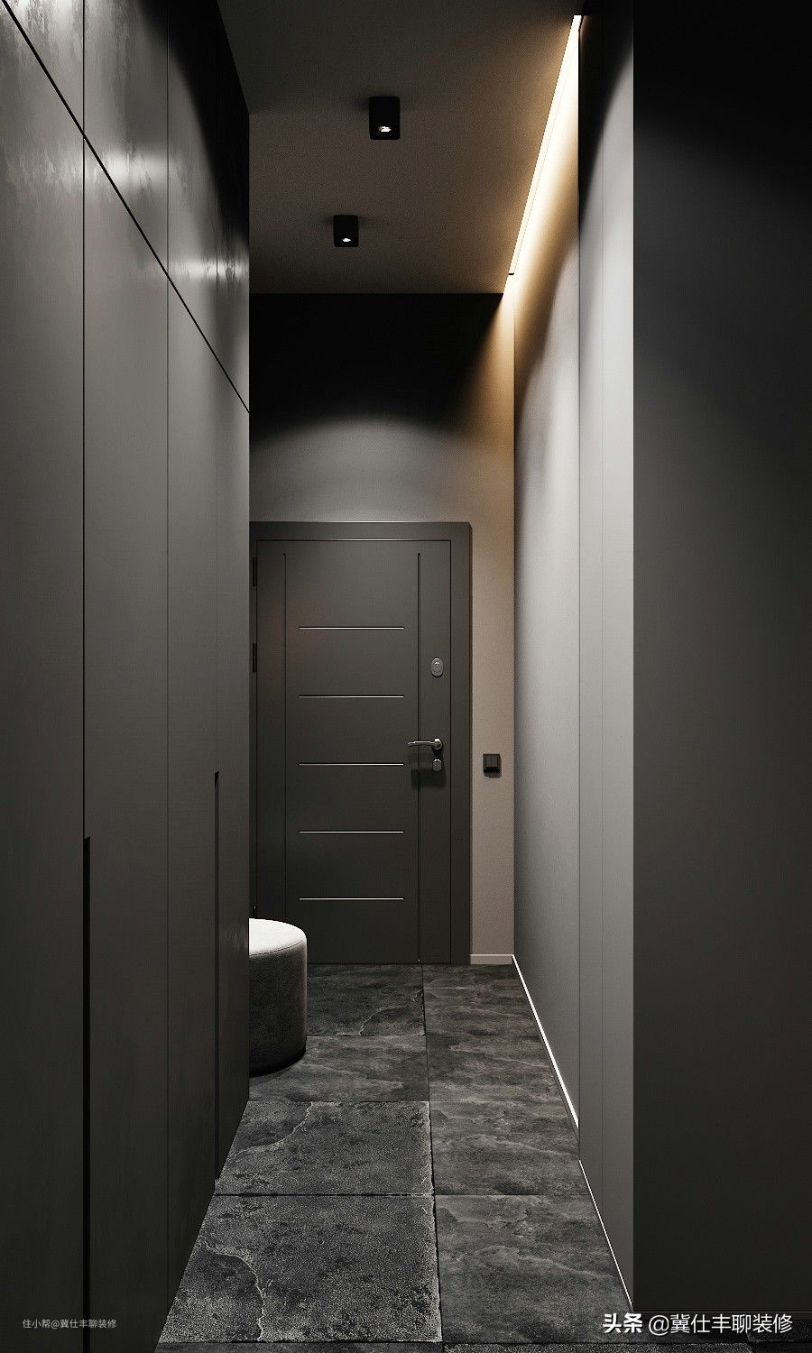 ▲ 进入玄关区,一侧是高级灰墙面,另一侧高级黑玄关柜门板,地面铺设黑色大理石瓷砖,吊顶和地面内嵌灯带,换鞋凳区域隔板上方再玄关两盏长线吊灯,一股炫酷的时尚气息扑面而来。洗衣机柜位于走廊区,因此加上柜门,以追求更为简洁的装修效果。