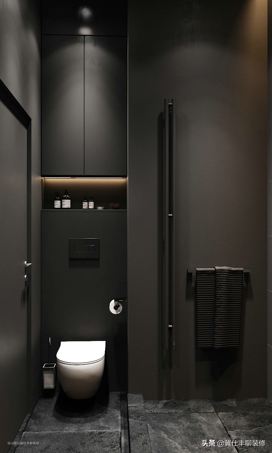 ▲ 卫生间的设计更为炫酷,高级灰和高级灰综合运用,壁挂马桶和洗手台都选择了纯白色,再以顶部的射灯照亮,搭配周围的暖光灯带,一切都是那么的静谧和个性。