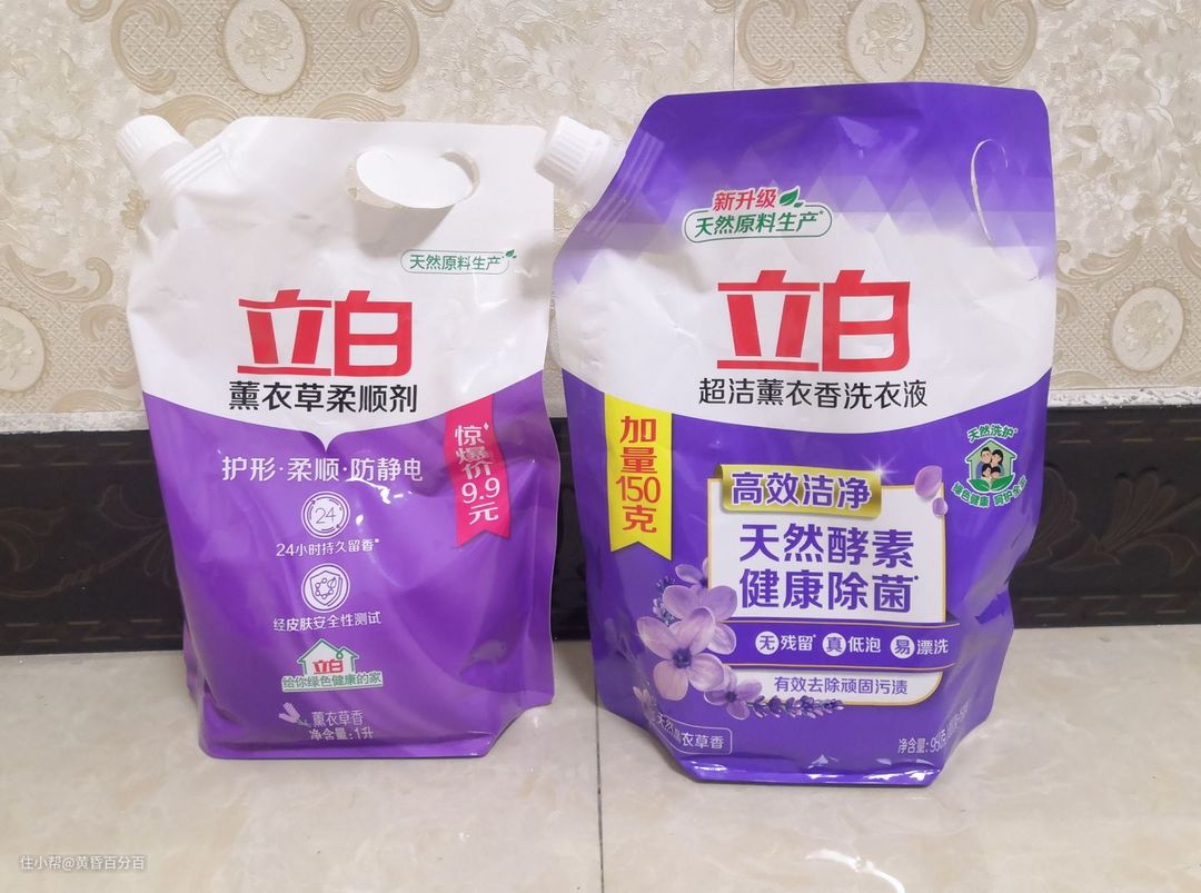 ▲随手买了袋补充装的洗衣液和柔顺剂,洗衣液为950g,柔顺剂为1L。