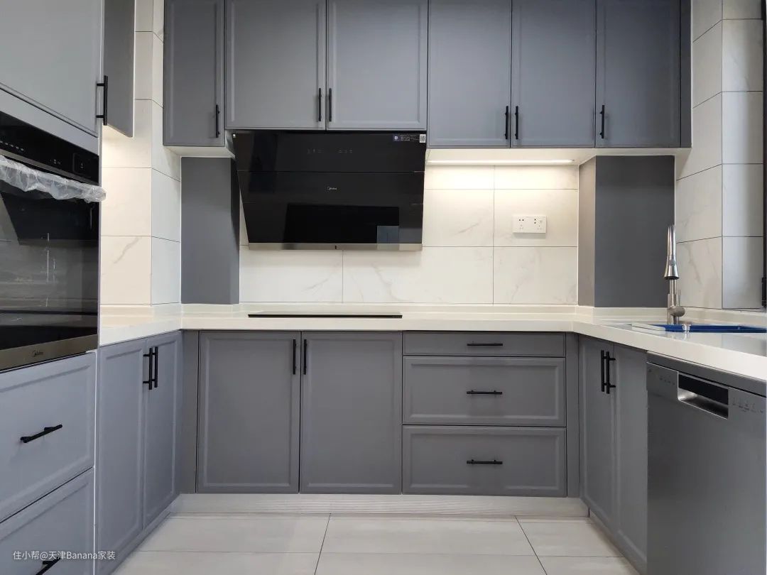 厨房整体选用灰蓝色肤感膜柜体,搭配黑色把手,以及白色墙面瓷砖。完美复刻现代感厨房的简洁与利落。
