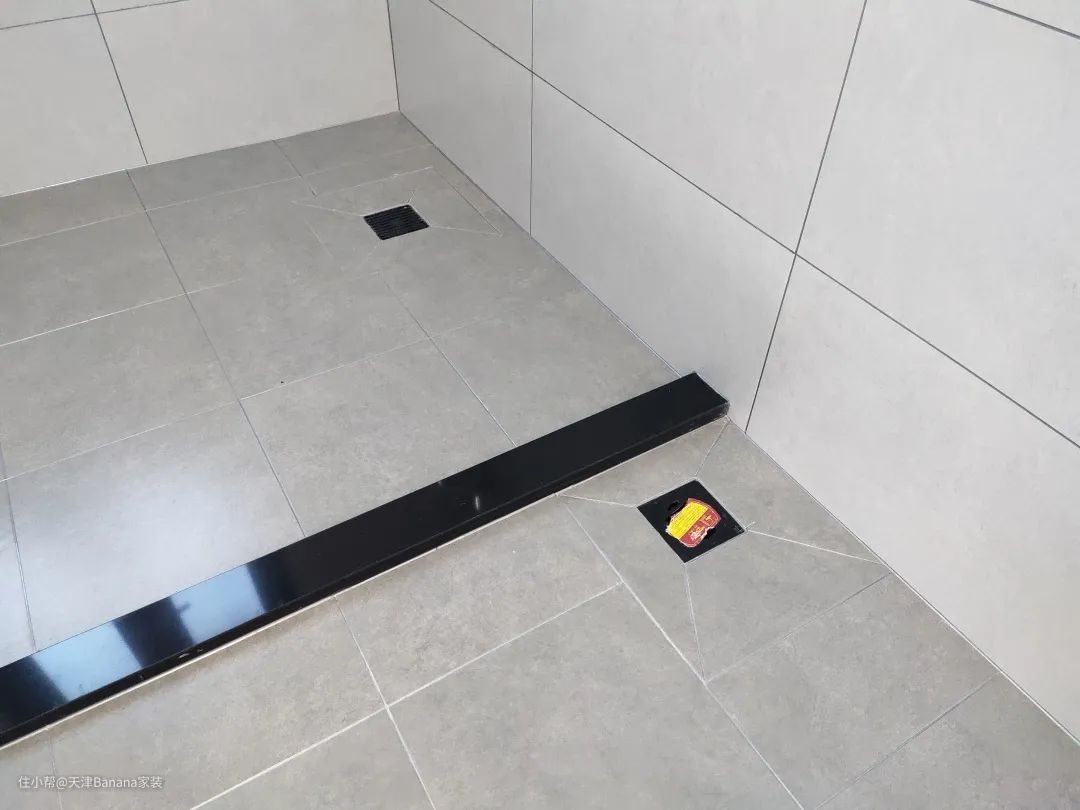 卫生间原始户型只有一个地漏,位于基石以内。于是在基石外预留了一个地漏,避免卫生间跑水的情况发生。