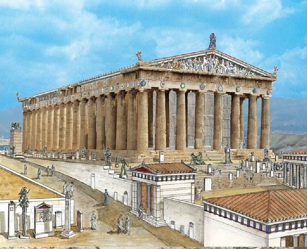 古希腊形成了相对稳定的石质梁柱式结构建筑形式以及规范化的标准格式,创造了多利克、爱奥尼亚、科林斯柱式,其风格端庄,亲切开朗、讲究构图、施工精确、精雕细刻,还运用视觉差纠正法取得了很高的艺术效果。
